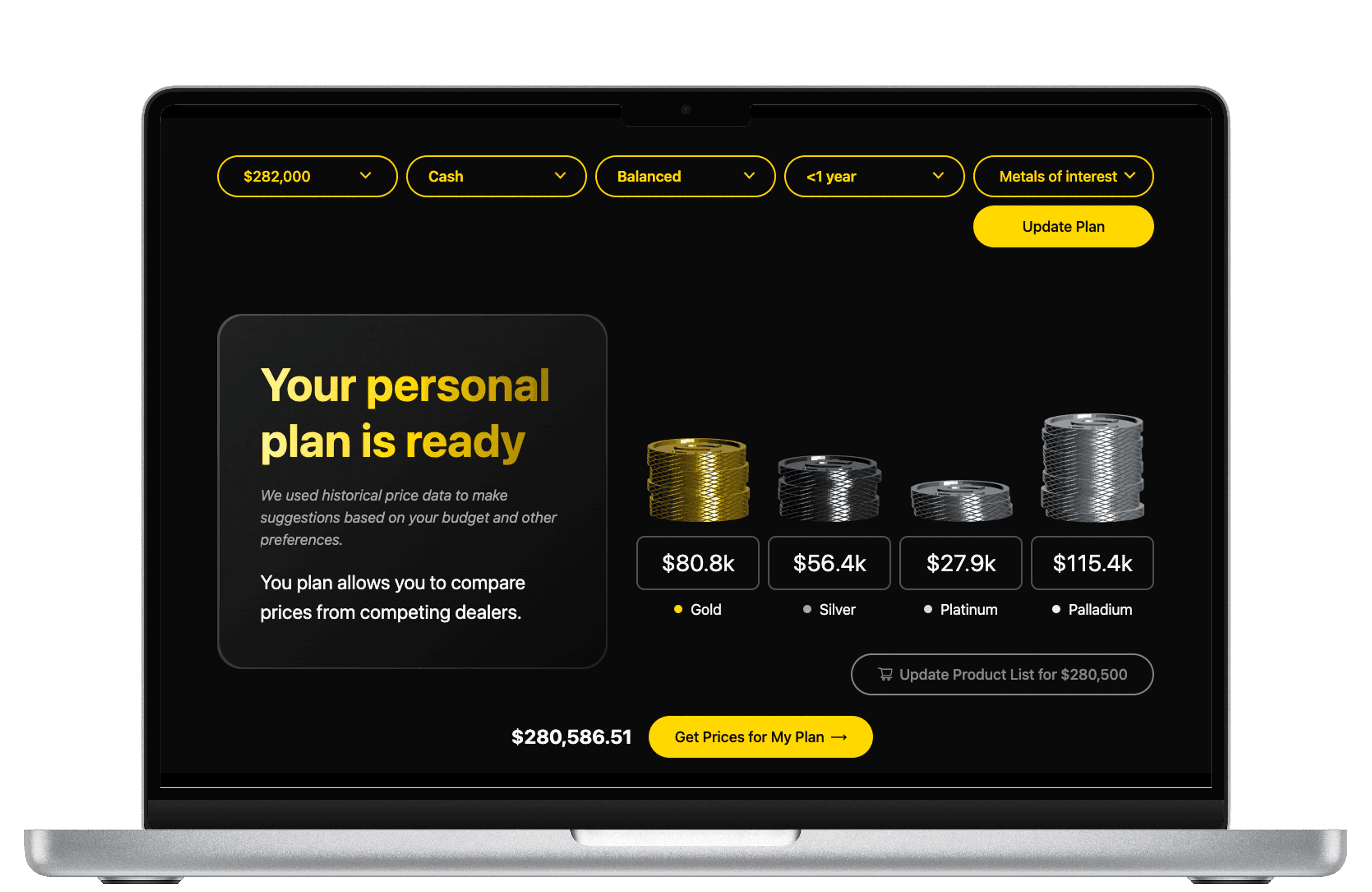 We send your plan to our select group of precious metals dealers. They put together price proposals for you and submit them to Metalsmart. You will be notified via email and then you can log in to Metalsmart dashboard to review their proposals.